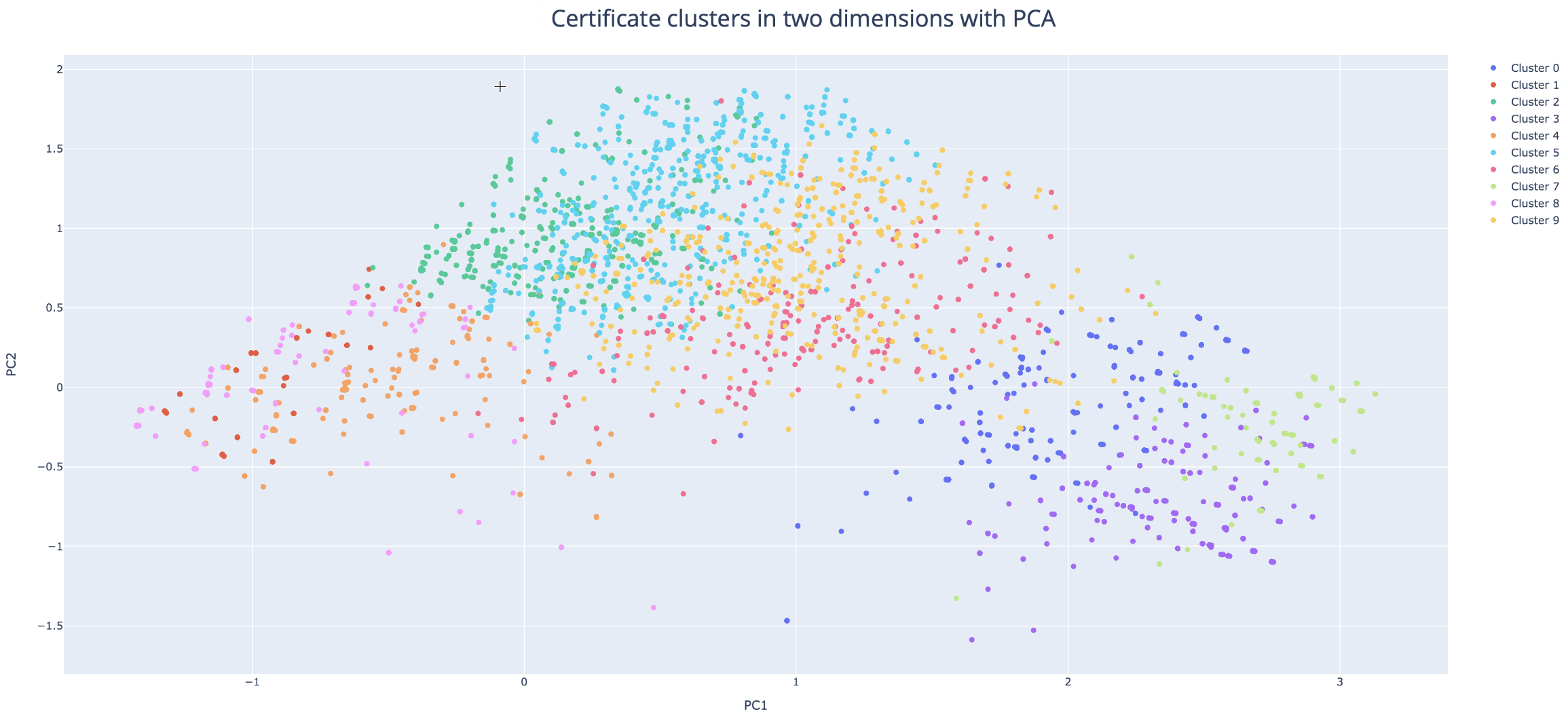 The top three PCA components accounted for approximately 61%, 10%, and 6% of the total explained variance (for a total of 77% of the overall data variance). Plots of the first 2 components in 2D space and top 3 components in 3D space grouped into the 10 clusters are shown below.